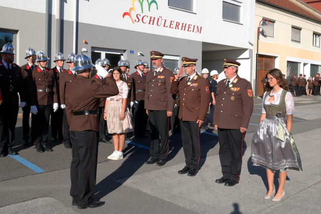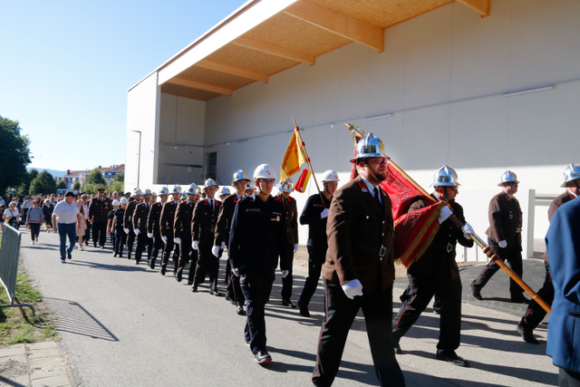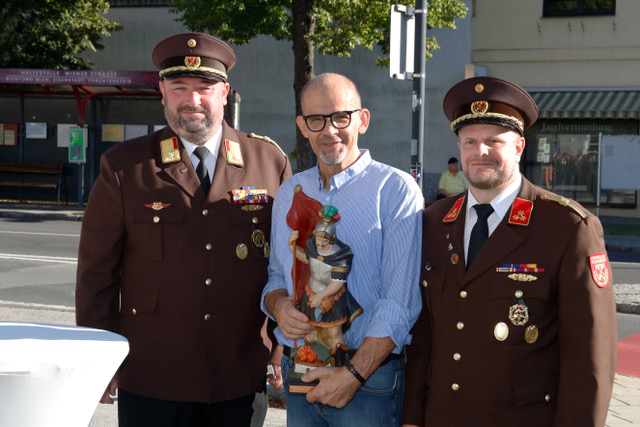 Der Sonntag begann mit dem feierlichen Empfang der Ehrengäste am Parkplatz des Restaurants „FlorianiHOFFMANN“. Dabei übergab die Feuerwehr eine rund 50 cm große Florianistatue an den neuen Besitzer des Lokals. Diese Statue war vor Jahren von der Feuerwehr gestiftet und im damaligen Florianihof aufgestellt worden. Mit der Wiederaufstellung am ursprünglichen Ort wurde die enge Verbindung zwischen Feuerwehr und Haus erneut sichtbar. Anschließend formierte sich der stattliche Zug aus Stadtkapelle Mattersburg, Ehrenzug, Ehrengästen und Gastfeuerwehren und marschierte zur Florianikapelle, wo eine Kranzniederlegung zum Gedenken an die verstorbenen Mitglieder stattfand. Danach bewegte sich der Festzug weiter ins große Festzelt. Dort wurde die Feldmesse von Stadtpfarrer Mag. Werner Riegler zelebriert, die den offiziellen Teil des Jubiläums einleitete.