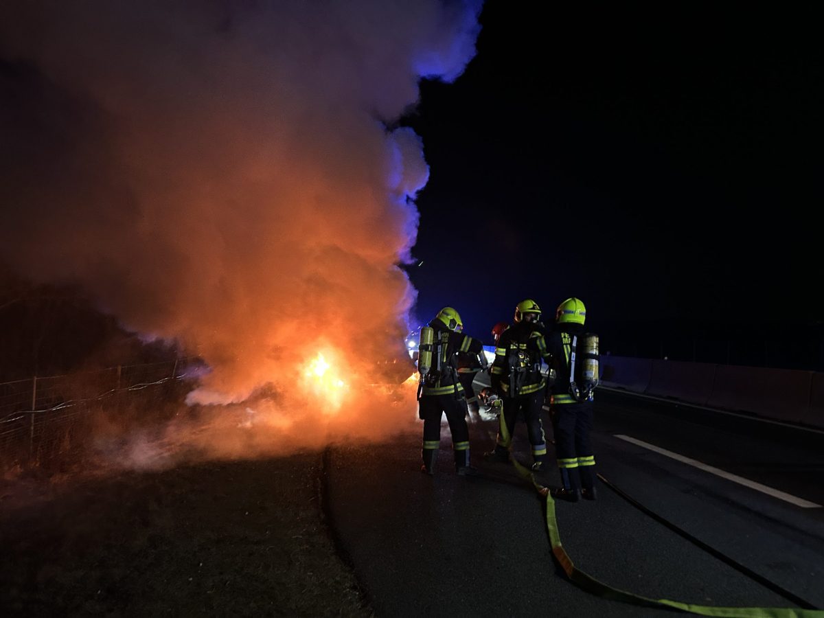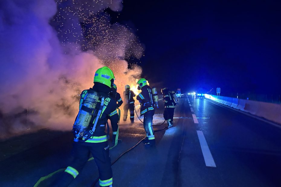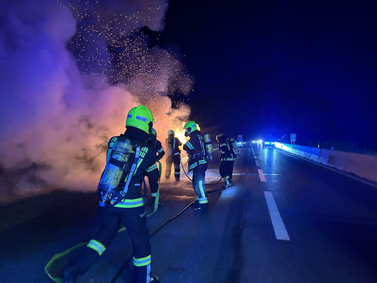 Die Feuerwehr Mattersburg wurde heute gemeinsam mit der Feuerwehr Bad Sauerbrunn und der Autobahnpolizei um kurz nach 18 Uhr zu einem Fahrzeugbrand auf die S4 in Fahrtrichtung Wiener Neustadt alarmiert. Der Einsatzort befand sich zwischen der Anschlussstelle Sigleß und der ehemaligen Raststation Pöttsching.